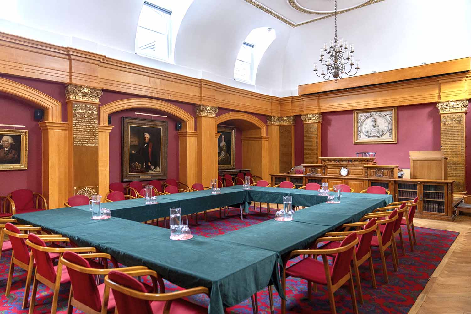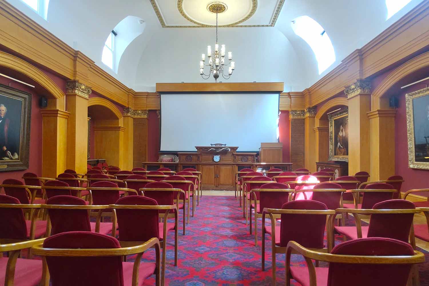 Lettsom Hall is a large, ornate historic room which can serve as a meeting room, conference hall, lecture theatre, instructional space, large classroom or dining room